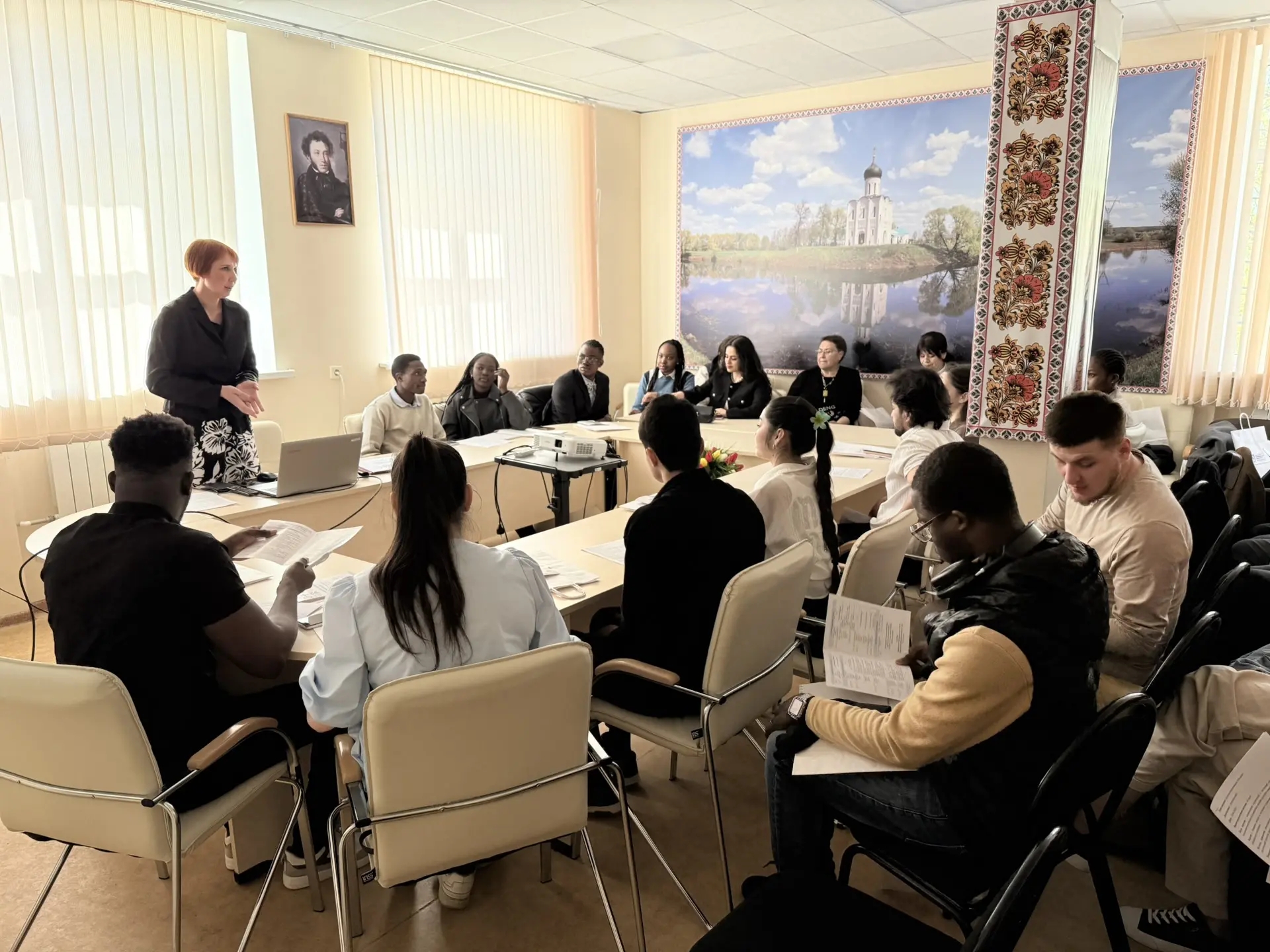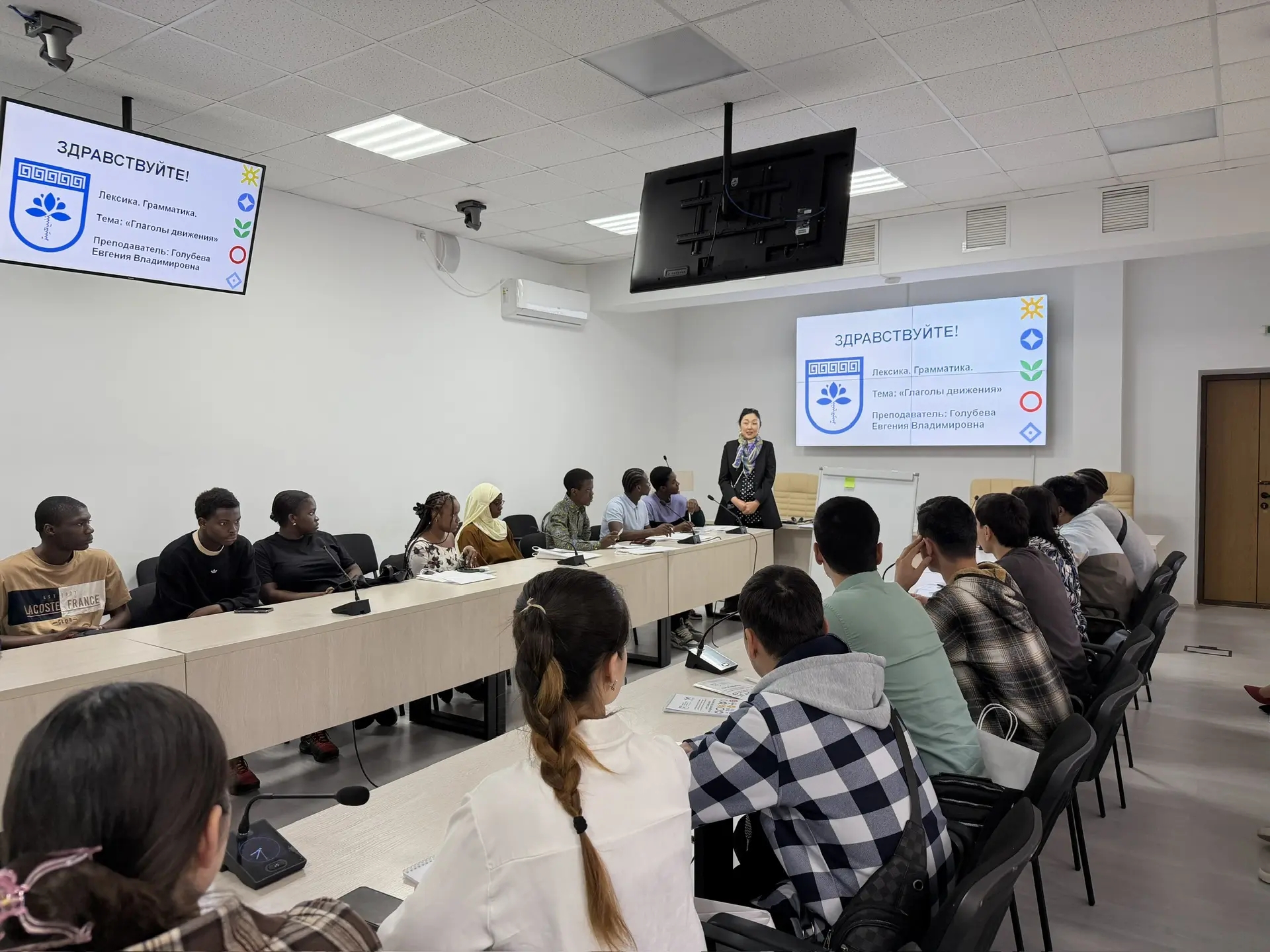 После знакомства с факультетом довузовской подготовки и обучения иностранных граждан слушатели и студенты из российских университетов разделились на два открытых занятия: доц. Голубева Е.В. провела урок на тему «Глаголы движения»; доц. Болдырева О.Н. дала урок по «Страноведению» на тему «Система образования в России».