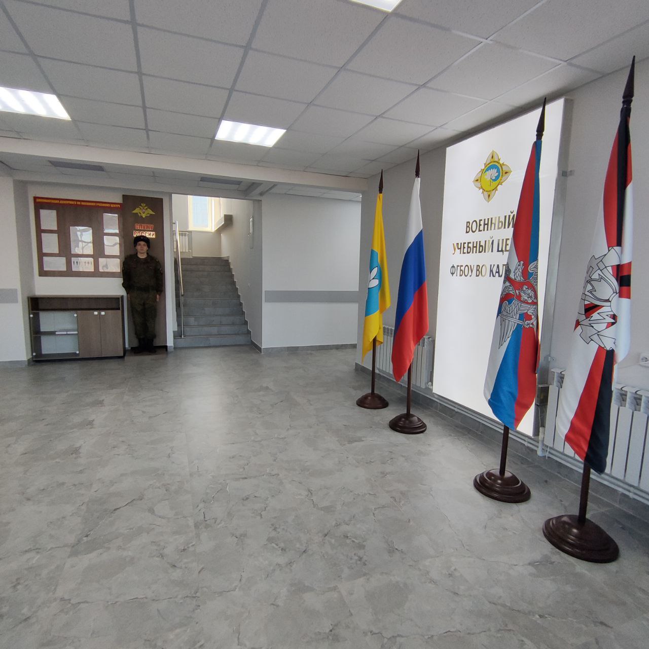 Для размещения ВУЦ при КалмГУ определено отдельно стоящее здание общей площадью – 666,5 кв.м, расположенное на удалении 3,6 км от главного кампуса КалмГУ по адресу: г. Элиста, проспект имени Петра Анацкого, д. 19. В здании 10 учебных помещений (учебная площадь 417,67 кв.м), в том числе тир в подвальном помещении, компьютерный класс на 30 посадочных мест (от Министерства обороны РФ), различного вида мультимедийное оборудование. Кроме этого, на прилегающей к зданию территории обустроен строевой плац.